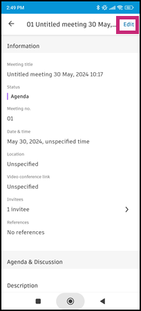 You can edit Meeting title, status, date, time and location. To do this, open the selected meeting and click Edit next to the header.