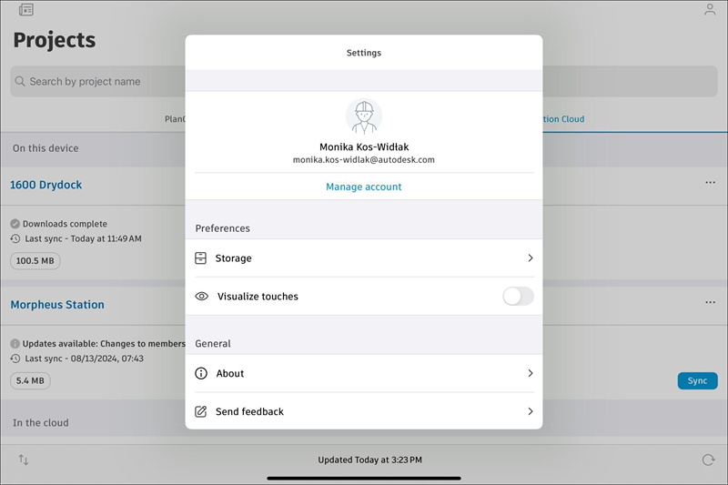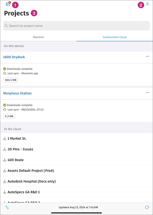 In each tab, all the projects you have access to are shown, and whether they have been downloaded On this device, or are available to download In the cloud. Learn how to download projects.