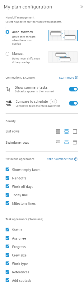 Auto-forward - When enabled, moving a task causes other tasks to be rescheduled automatically to avoid overlaps. Auto-forward is only available for users with Create or Manage permissions to the Plan.