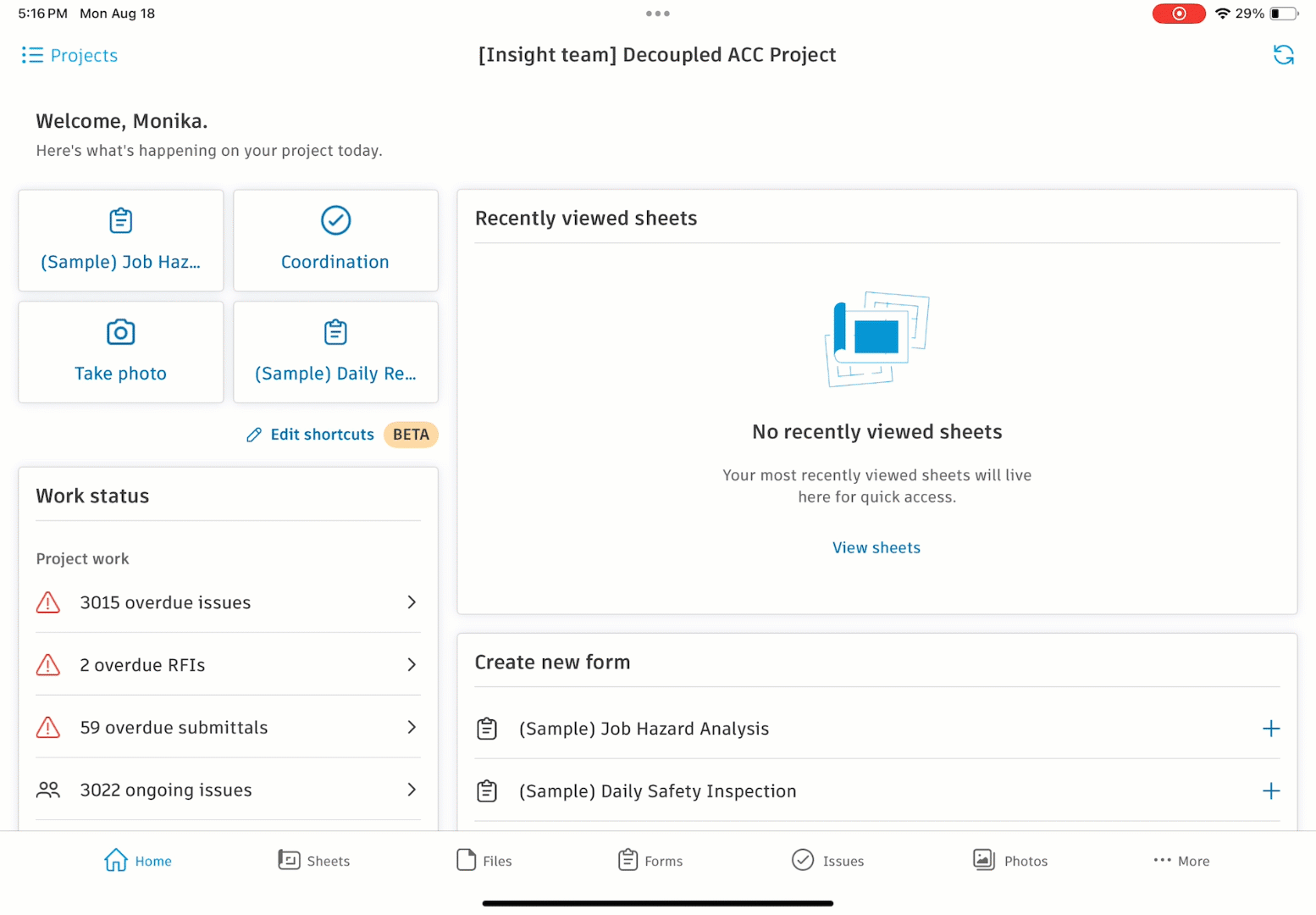 Project Home on the Autodesk Construction Cloud mobile app provides you with an overview of recent changes on your project from your iOS or Android device. Use Project Home to quickly access recent sheets, files, issues, forms, and Shortcuts.
