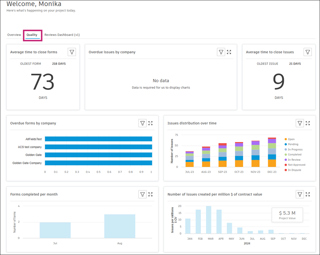 Click the Quality tab in Project Home to display construction KPIs and metrics.