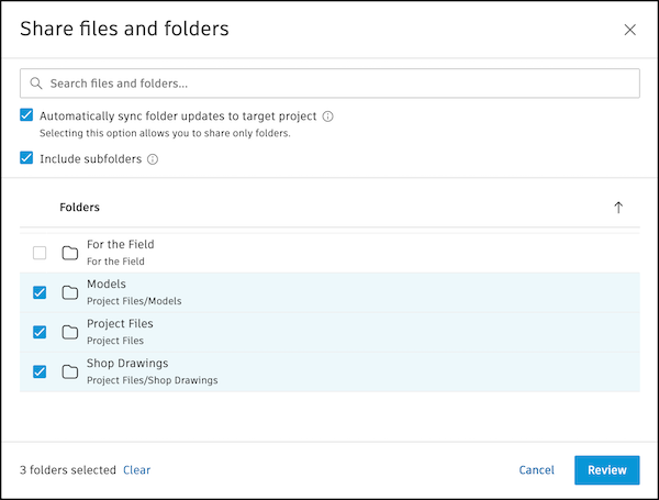 (Optional) Select Automatically import folder updates into target project to create a folder automation. In a folder automation, when updates are made to the selected folders in the source project, the target project will receive the updates. This feature is useful for making sure that the stakeholders you shared the folders with will always automatically have the most updated files.