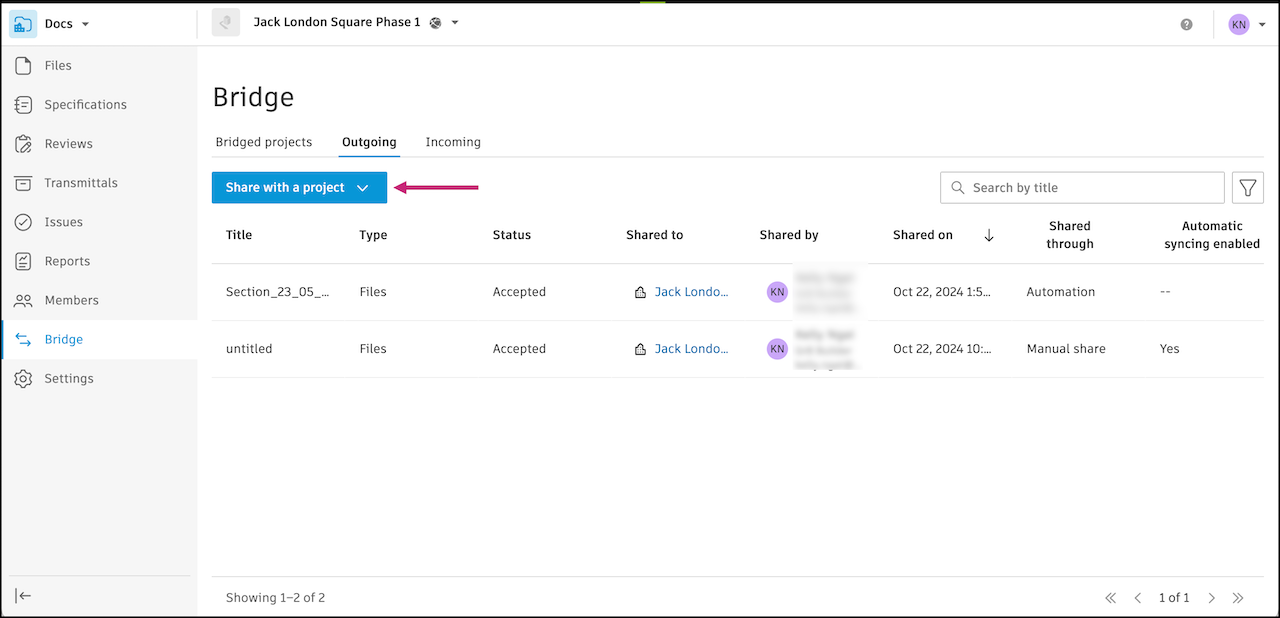 You can share sheets, files, and folders with another project directly from the Outgoing tab in the Bridge tool.
