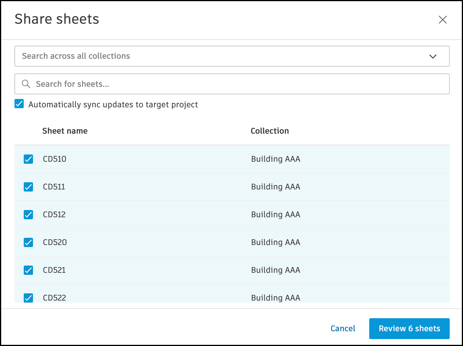 Check Automatically sync updates to target project if you want to create a sheet automation. If the sheets you share in the source project are updated, they will automatically update in the target project.