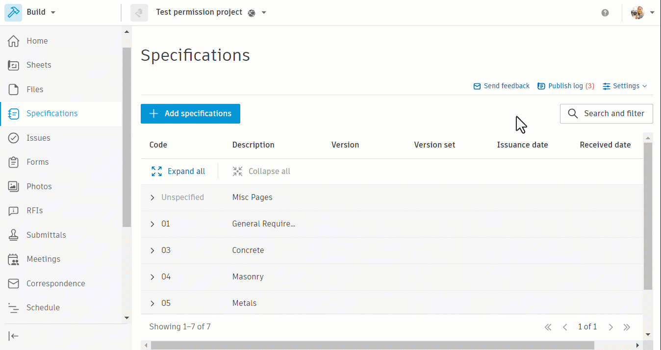 1. Click Specifications from the left navigation to open the Specifications tool.