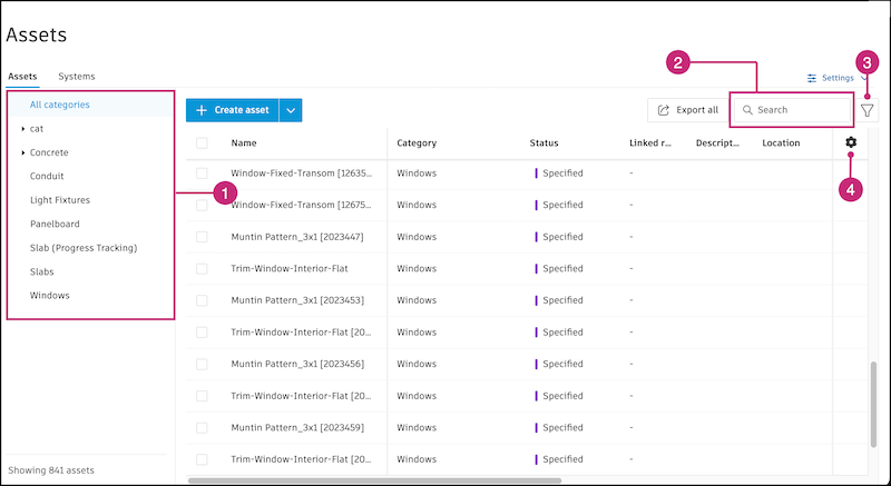 Tip: You can resize the left panel by holding and dragging the vertical line next to the panel.Use the search field to search for an asset by name.