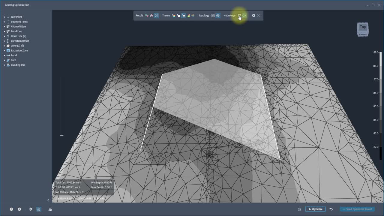 In Grading Optimization, enable Hydrology Direction Vectors and Wireframe Topology on the Visualization Toolbar to observe that the inclination of the triangles in the zone are in a uniform direction at the angle specified.