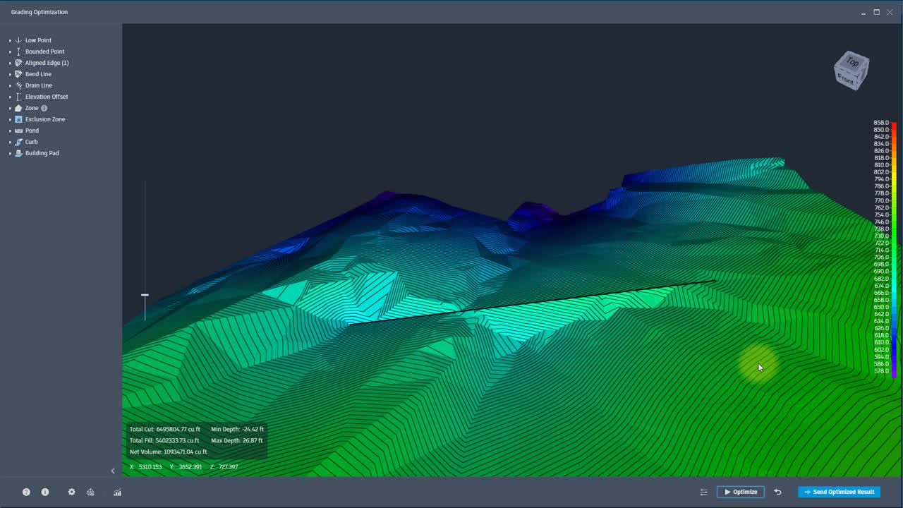 Use Aligned Edges in Grading Optimization to create linear elevations with a consistent slope which is necessary for wall locations and parking lot ridge lines.