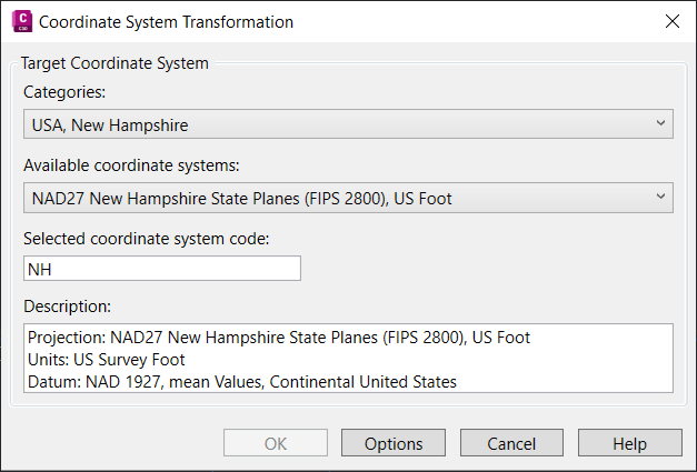 The Coordinate System Transformation dialog box opens showing the current coordinate system.