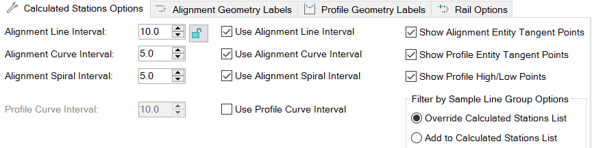 These settings control the content of the Calculated Stations sub-object list for alignments and profiles.
