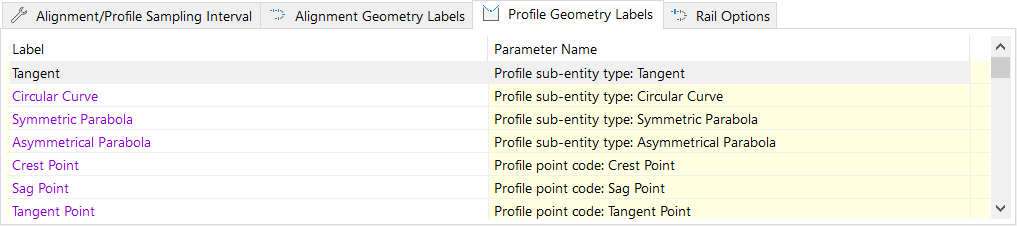 This set of options provides control over any localizable or customizable phrases for alignment entity or sub-entity types, spiral types, constraint types, and point types that appear in the Project Explorer user interface or in outgoing reports, spreadsheets, and AutoCAD tables.