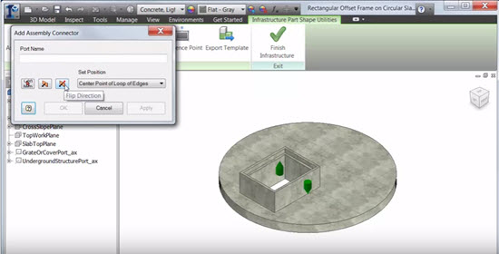 Assembly connectors are added to drainage structure part families so that the individual part families can fit together properly when they are combined into an assembly. Once you add assembly connectors to a parametric shape model, directional arrows are displayed on the shape. The assembly connectors will be displayed as green arrows when they positioned correctly; invalid assembly connectors will display as red arrows.
