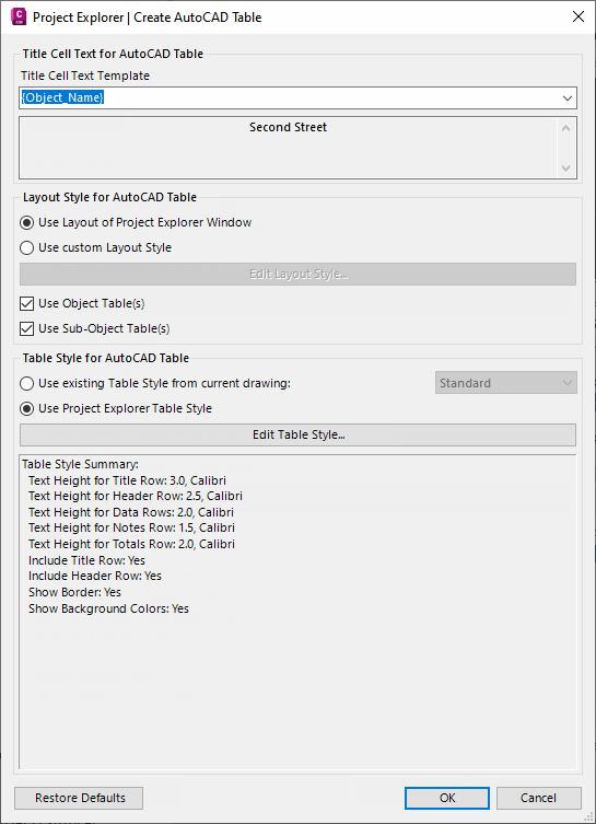 In the Create Object Set window, choose a Layout Style and Table Style and set the insertion point for the table(s) that you would like to generate. Finally, choose whether the table(s) should be updated manually or dynamically. The table(s) can then be generated with a mouse click on the Run Action button in the Object Sets tab within the Project Explorer window.