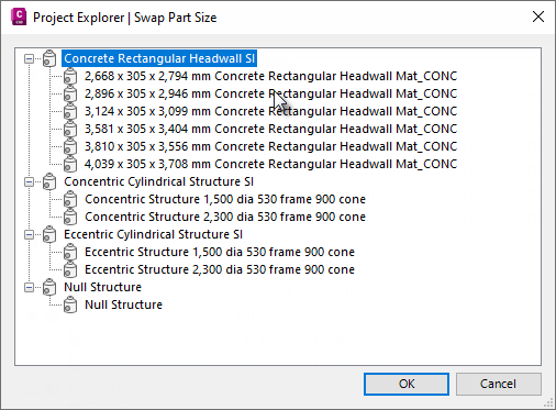 To modify the part size of multiple structures or pipes, select the Pipe Networks tab in the Project Explorer window and ensure that the structures or pipes sub-object tab is active. Select the structures or pipes that you would like to assign the new part size to, then select Swap Parts from the right-click menu. Any changes are reflected instantly in the AutoCAD viewport and the Project Explorer window.