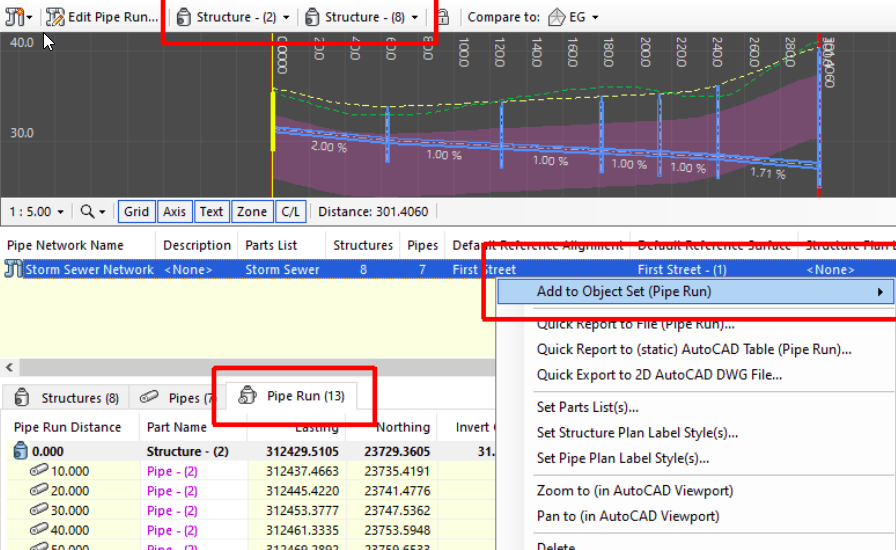 - Open the Pipe Networks tab of the main Project Explorer window. From the main toolbar, set the start structure of the Pipe Network profile view to Structure - (2) and the end structure to Structure - (8). This determines the path and route of the displayed pipe run. Set the comparison surface of the pipe run to First Street - (1).
