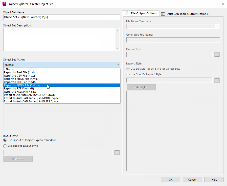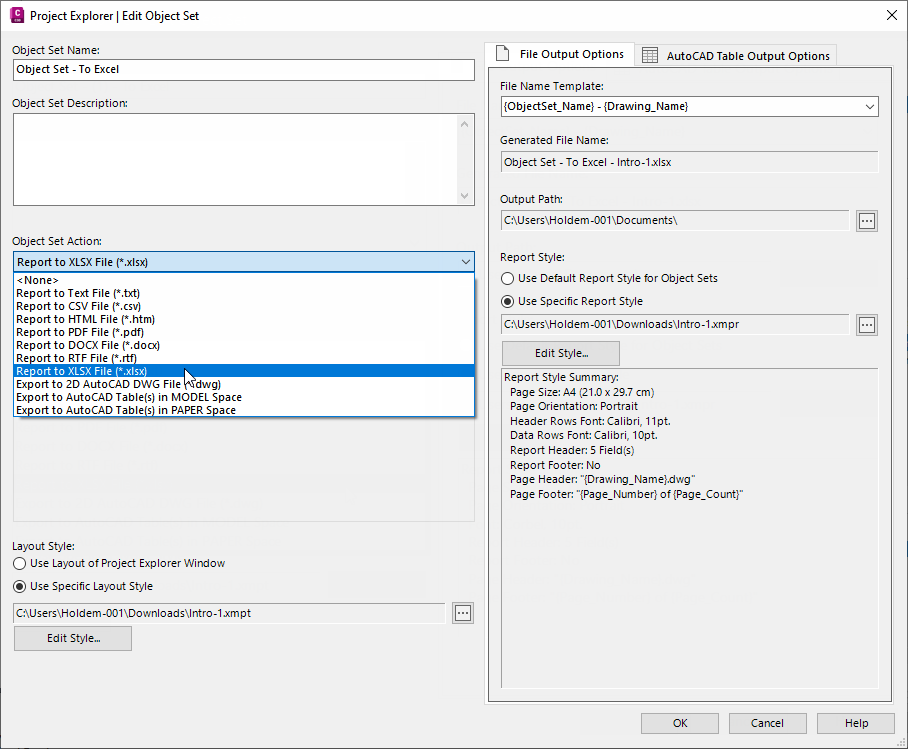 Note that the file name of the outgoing report file can be derived from a series of dynamic variables, or you can specify a fixed file name in this dialog. In this case, you'll use the default option, the outgoing file name will be made up of a combination of the object set name and the drawing name.