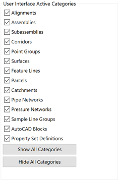 When undertaking certain tasks in Project Explorer, it is sometimes preferable to disable or hide any Civil 3D Object Categories from the Project Explorer window which are not in use.
