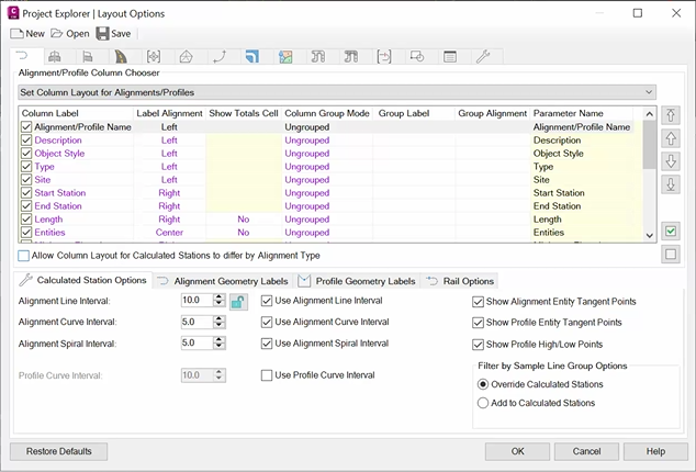In addition to the standard column layout and labelling options, the Alignments tab in the Layout Options window provides a series of dedicated options for controlling the display and formatting of alignment and profile related station and entity data.