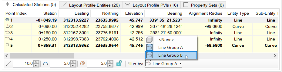 Set the station sampling interval for alignments on line, spiral, and curve entities. Optionally, the interval for certain entity types can be disabled which can be useful if you only need interval points on spirals or curves. To use a common alignment interval for all entity types, use the Lock Station Intervals check button.