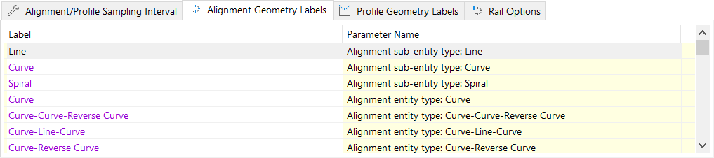 This set of options provides control over any localizable or customizable phrases for alignment entity or sub-entity types, spiral types, constraint types, and point types that appear in the Project Explorer user interface or in outgoing reports, spreadsheets, and AutoCAD tables.