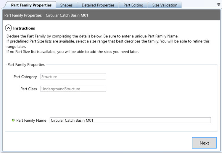 Note: For Pipe families in the Drainage Structure domain, select a Pipe Form shape and choose a size range. These parts have standard sizing predefined, so by defining the size range a default set of part sizes can be set.