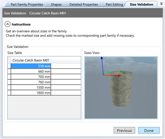 The Sizes View panel will display a preview of the selected size.Tip: You can drag the Size Validation tab off the Parts Editor window by selecting the tab and dragging the Size Validation window anywhere on your desktop. This is useful if you are validating more than one Part Family. The window will remain open and update continuously as you use the Navigation Panel to select different part families.