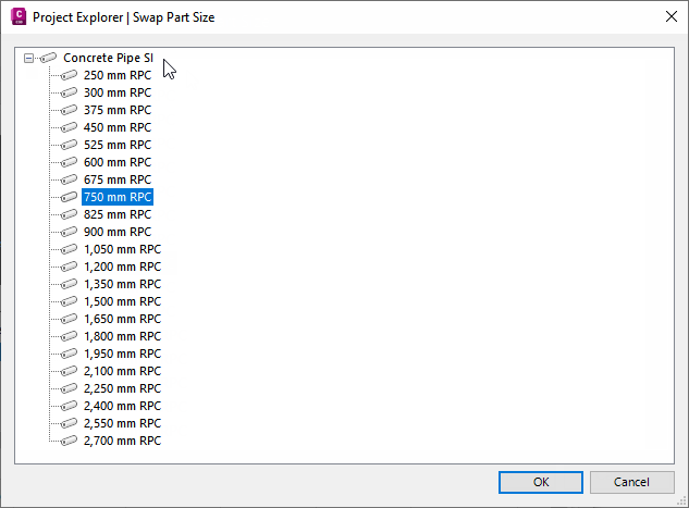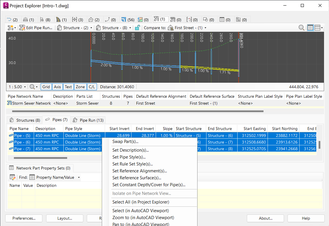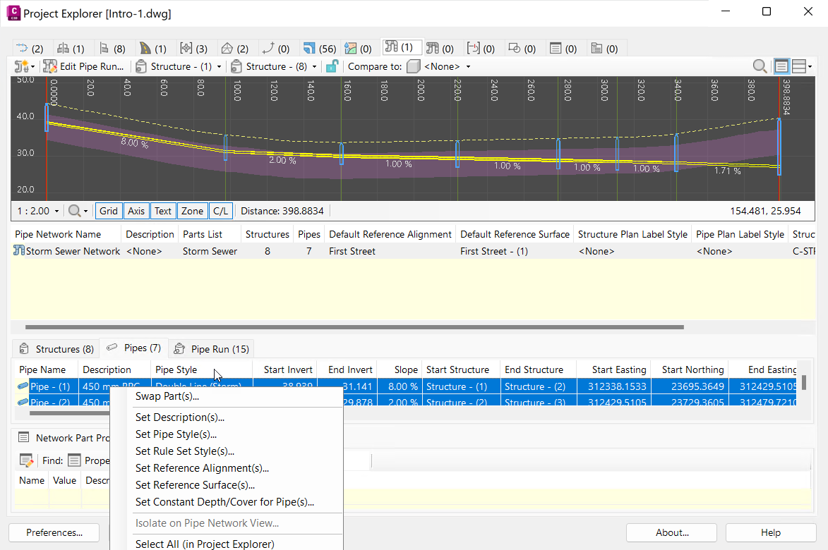 Project Explorer allows multiple pipe network parts to be swapped in a single operation. You'll use this tool now to make some changes to the pipe diameters on the pipe run.