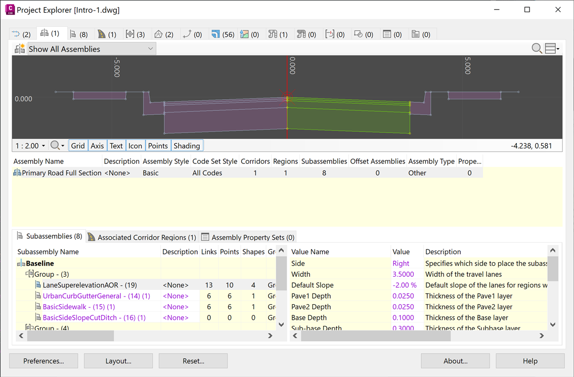 - In the subassemblies list for this assembly, select LaneSuperelevationAOR - (19).