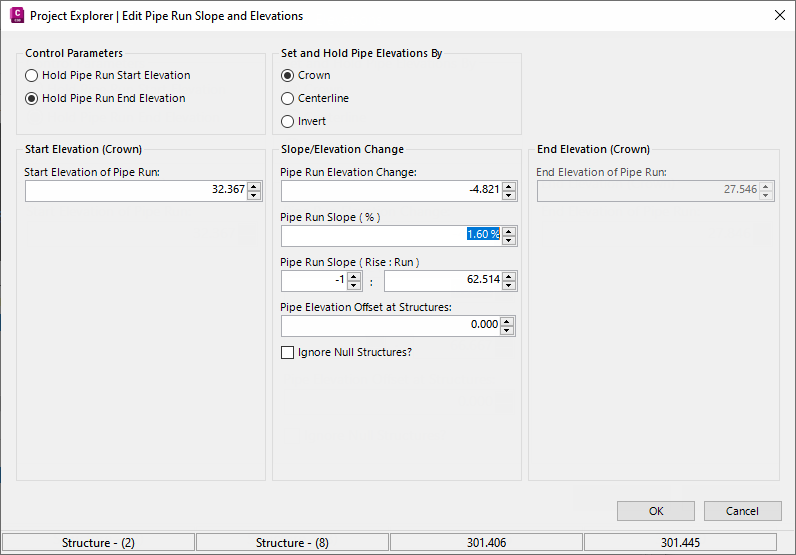 - The Edit Pipe Run Slope and Elevations dialog opens.