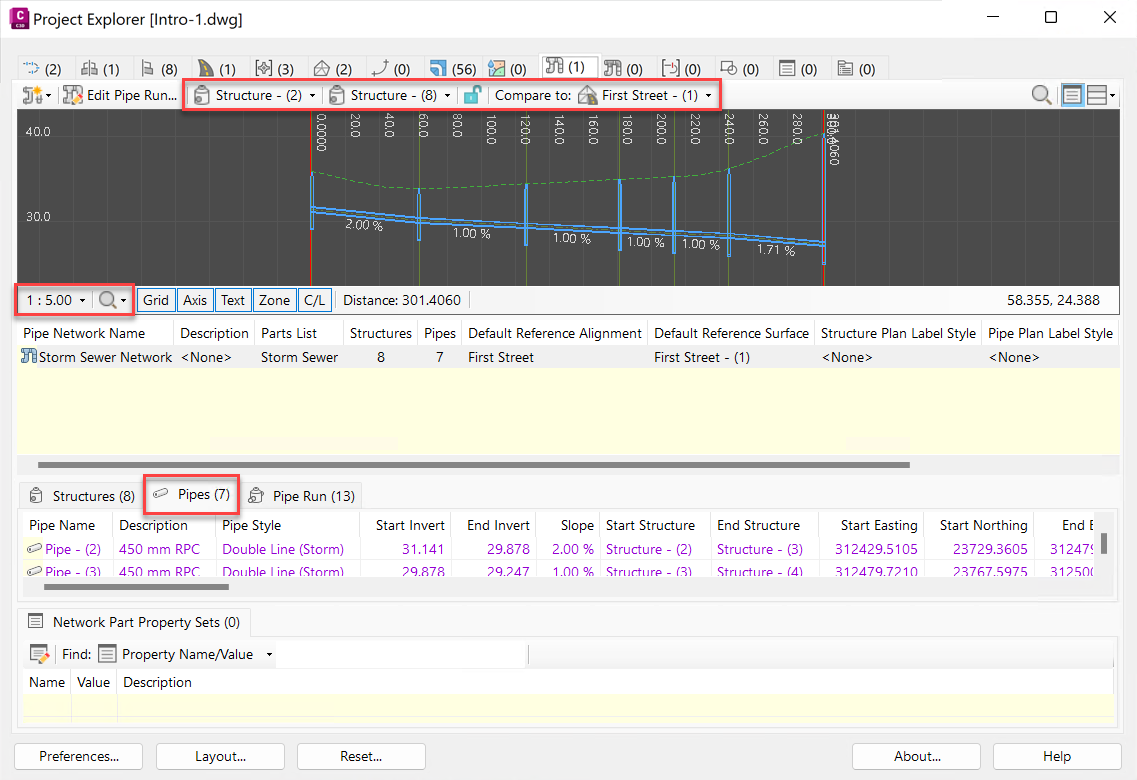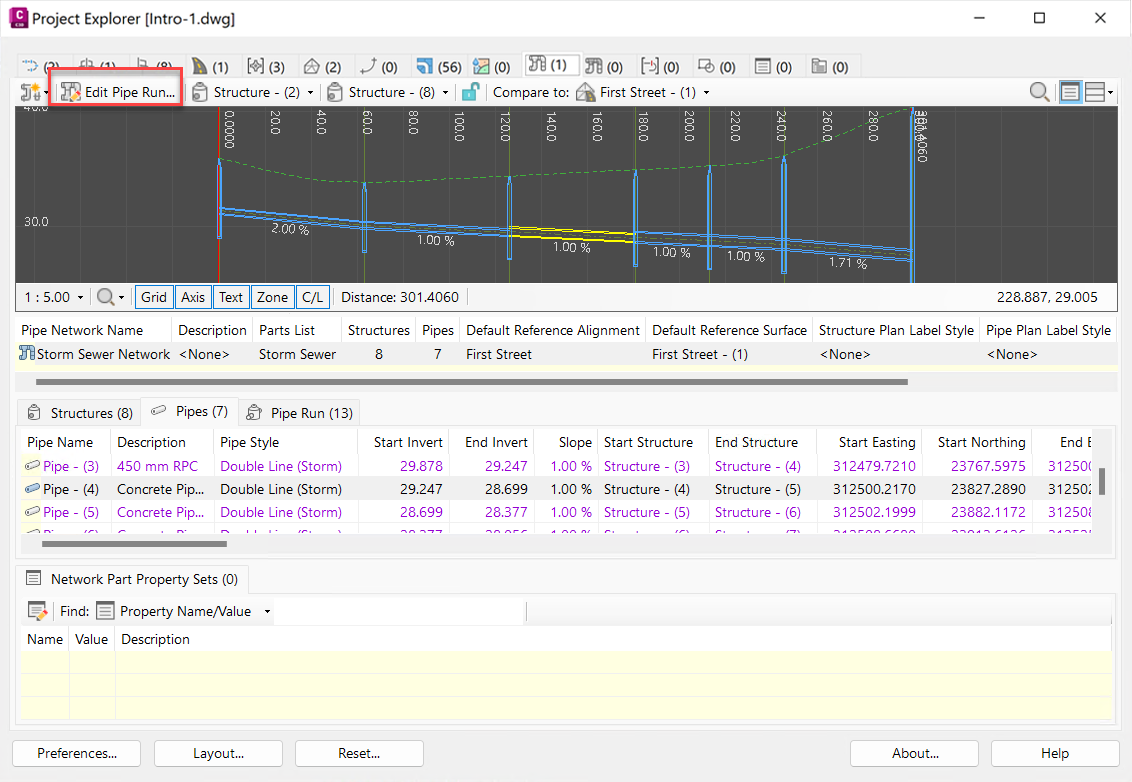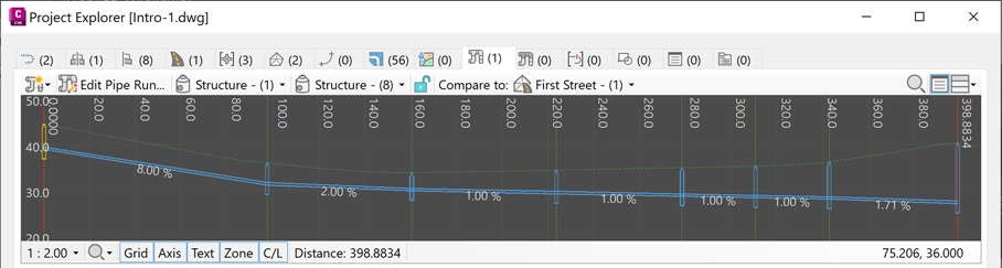 Project Explorer allows the slope of an entire pipe run to be adjusted in a single operation. Let's try this now: