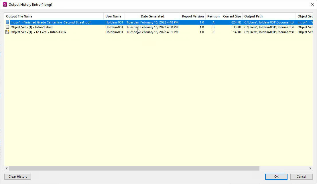 Project Explorer keeps a persistent record of every report it has generated from a given AutoCAD drawing. These records can be reviewed from the Output History window. This dialog box can be accessed in two ways: