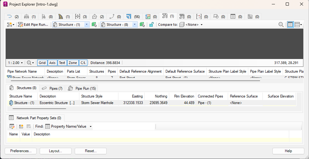 Some later steps in this tutorial depend on having a reference surface set for all structures and pipes in this pipe network. Project Explorer allows the reference surface to be set for multiple parts of a pipe network in a single operation.