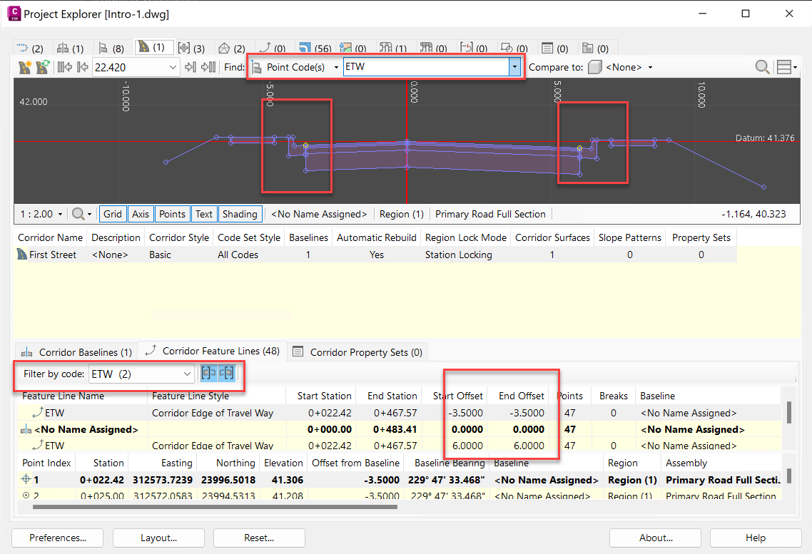 - In the corridor feature lines list, scroll down to find and select ETW from the list. Verify that the baseline offset is now set to 6.000.