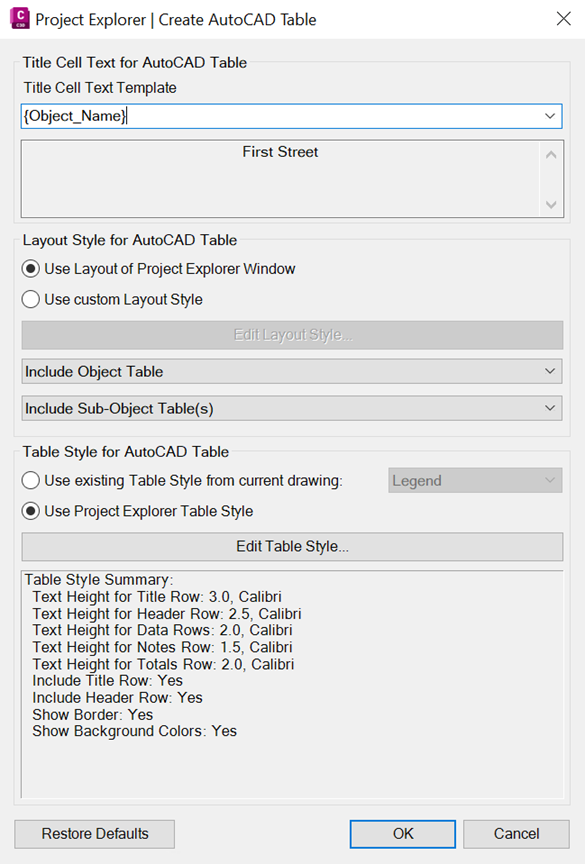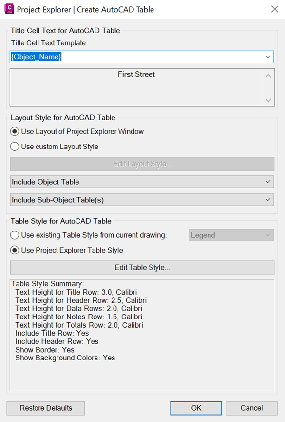 To re-use the AutoCAD table style which was created for the alignment table, ensure that Use existing Table Style from current drawing is selected, and select Project Explorer - (1) from the list of existing table styles.