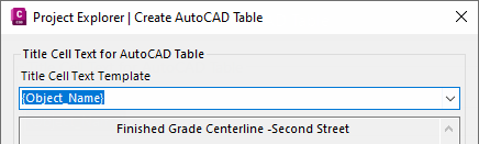 Note that the title row of the AutoCAD table can be derived from a series of dynamic variables during the creation process, or you can specify a fixed file name in this dialog box. By default, the title row will display the selected object name.