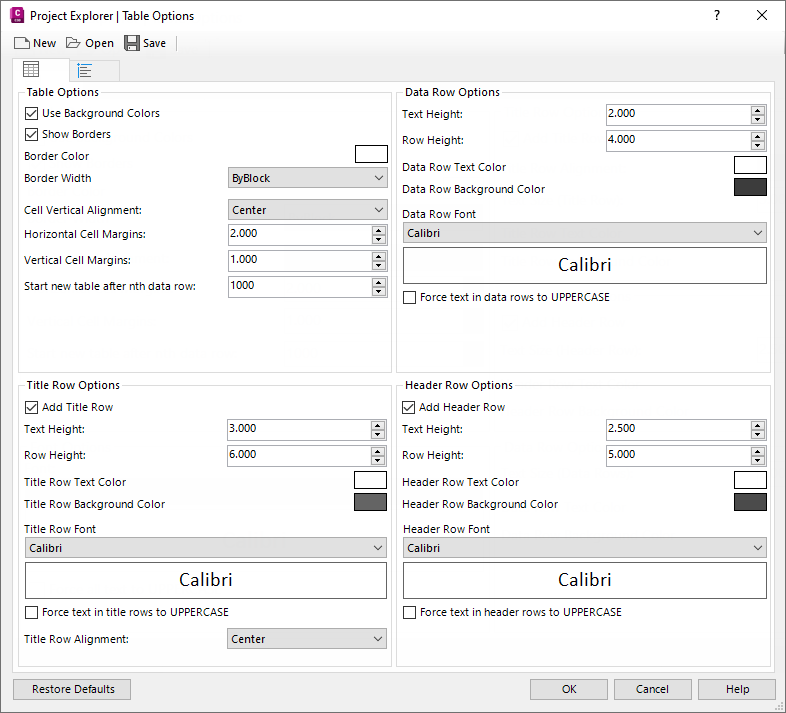 In the Create AutoCAD table dialog box, check that the Use Project Explorer Table Style option is selected then click the Edit Table Style button. The Table Options dialog box opens. This dialog allows you to define what the table will look like.