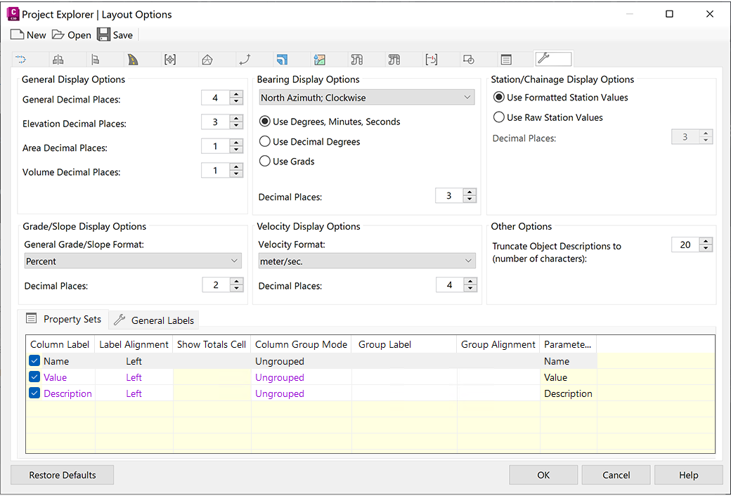- Select the General tab and note the options here to set the format of numerical values such as angles/bearings, stations, elevations, and slopes. Again, changes applied here will only affect the content of the table.