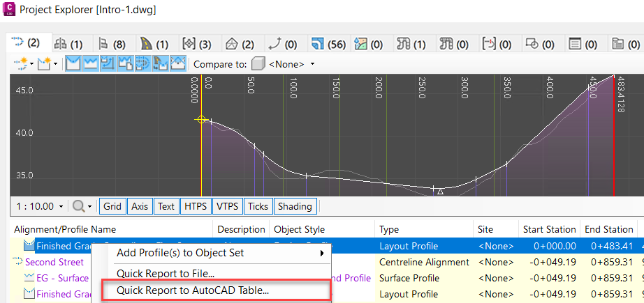 You can right-click any listed item in the Project Explorer window to access the AutoCAD Table creation options. Start by placing an alignment/profile report into our first AutoCAD table:- From the Civil 3D ribbon, select the Add-Ins tab and open the Project Explorer window.
