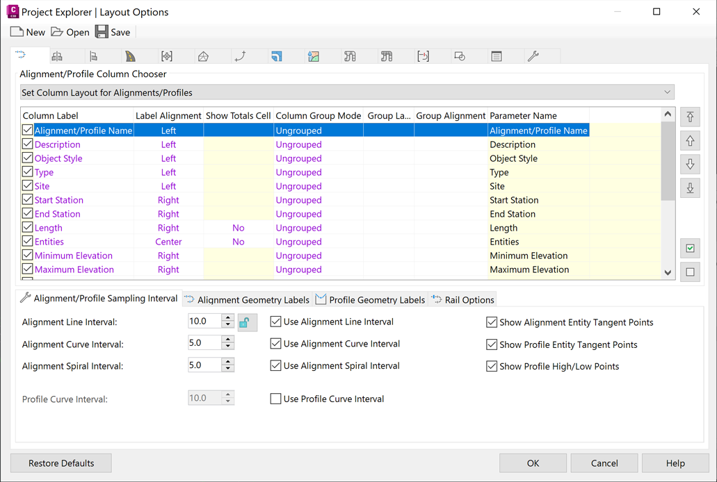 - On the Alignments tab of the Layout Options dialog box, ensure that Set Column Layout for Alignments/Profiles is selected.