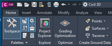 Access the Project Explorer window can be accessed from the Home tab of the main Autodesk Civil 3D ribbon.