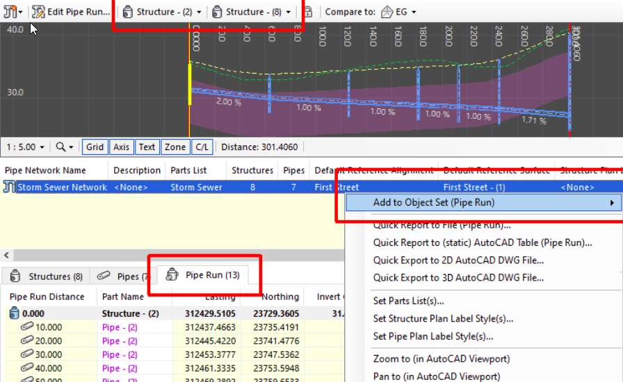Object Sets allow complex reports to be generated, featuring a range of content from a Civil 3D model. In this example, the report will include a pipe run between two specific structures on a pipe network, and a station based report of the gutter lines on a corridor.
