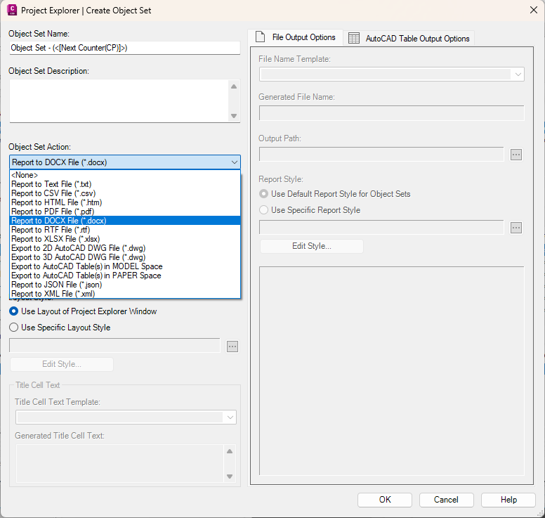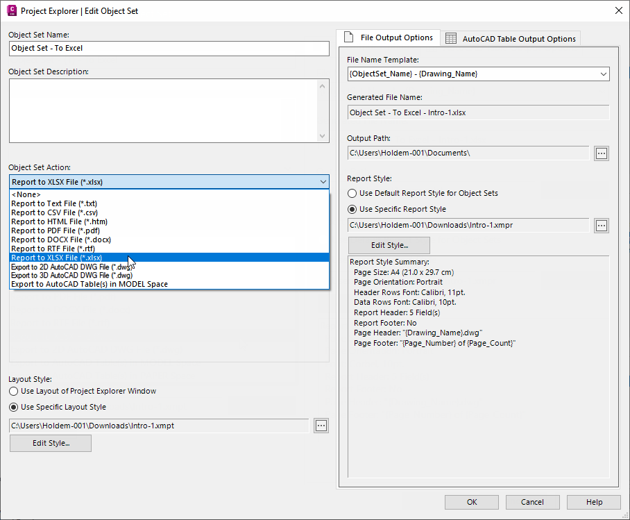 Note that the file name of the outgoing report file can be derived from a series of dynamic variables, or you can specify a fixed file name in this dialog. In this case, you'll use the default option, the outgoing file name will be made up of a combination of the object set name and the drawing name.