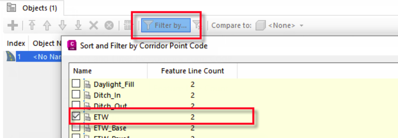 - Optionally, you can now specify the corridor feature lines to include in your report by adding a point code filter. Click the Add/Edit Filter button to open the Sort and Filter Content dialog. Select the ETW point code and click OK.