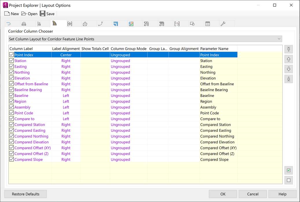 - On the Corridors tab of the Layout Options dialog box, ensure that Configure Column Layout for Corridor Feature Line Points is selected.