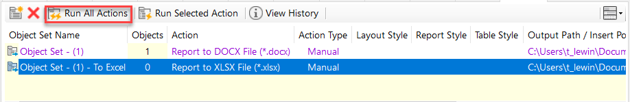 - Click the Run All Actions button in the main toolbar. Actions are processed from all object sets in the drawing, which in this case will cause your report to simultaneously be written to a DOCX file and an XLSX file. Review the resulting files in Microsoft Word and Microsoft Excel.