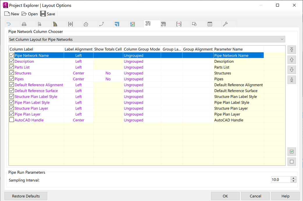 - Change the drop-down list to Configure Column Layout for Pipe Runs.