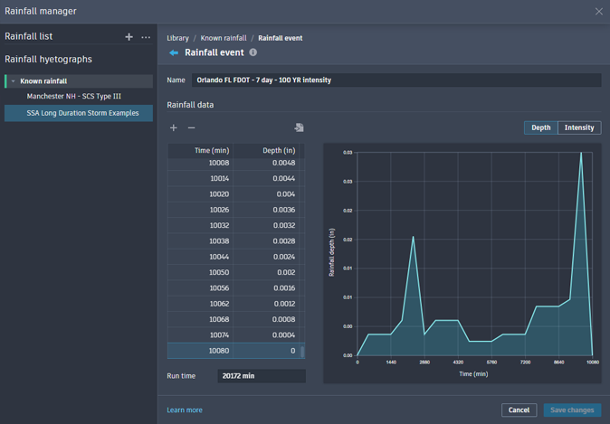 To support the analytical workflows, a rainfall manager for the creation and management of rainfall events is included. Learn more.