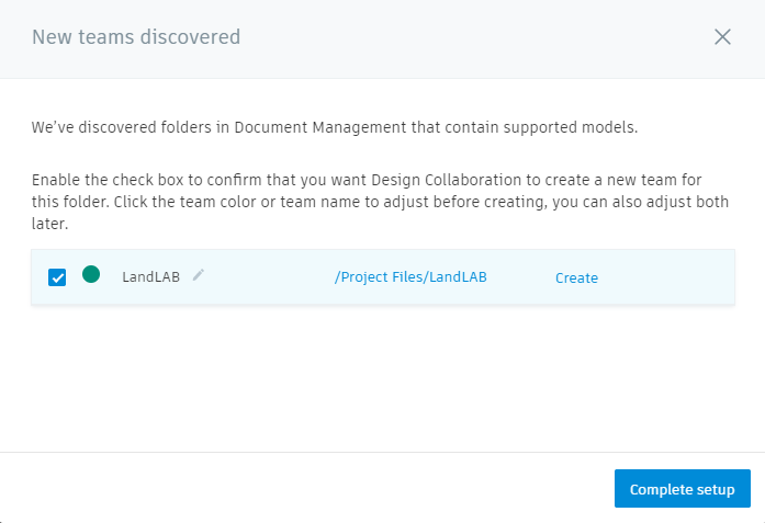 If you have models saved to a subfolder of Project Files, in the Files tool in Docs, Design Collaboration detects those files and displays a notification that prompts you to create a team for that folder. This can save time when setting up Design Collaboration for multiple teams or even for internal collaboration. The notification appears in the Home tool and the Settings tool.