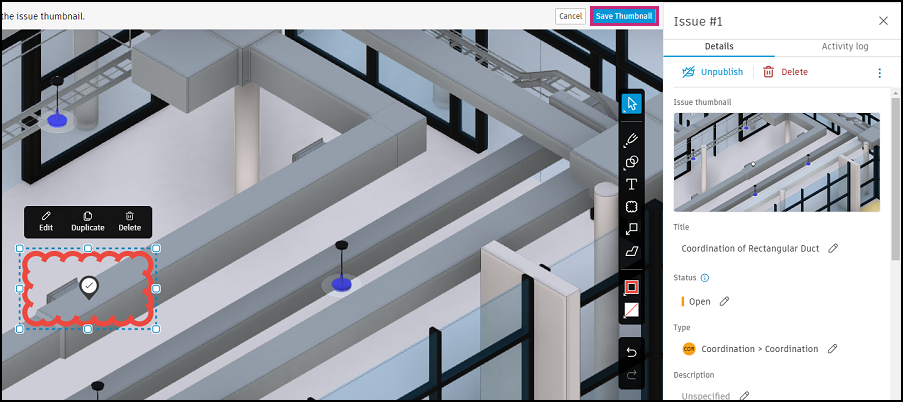 Note: Markups cannot be edited after you've saved the thumbnail.The thumbnail will now display the issue pushpin and the added markups.