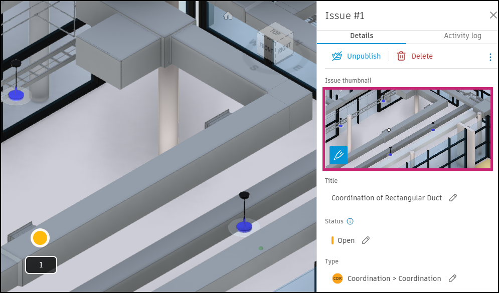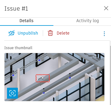 Note: If multiple models are open in the viewer, the issue will be associated with the model where the pushpin is placed. In Build and Docs, the Placement field of the issue will refer to that model file. We recommend placing the pushpin on the model that needs to be modified.The new issue thumbnail will display in the issues Details tab. You can click the thumbnail to open the full size version.
